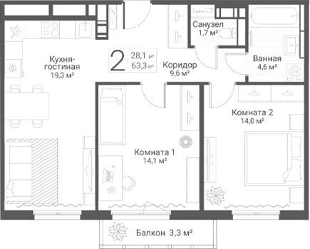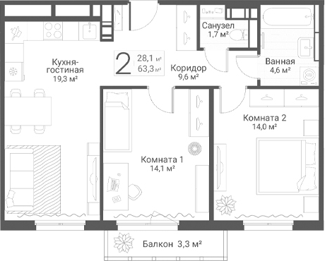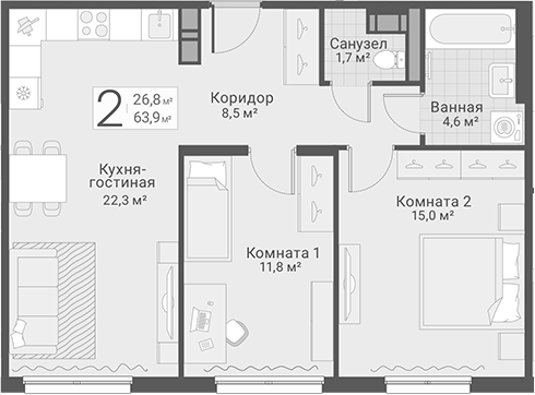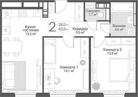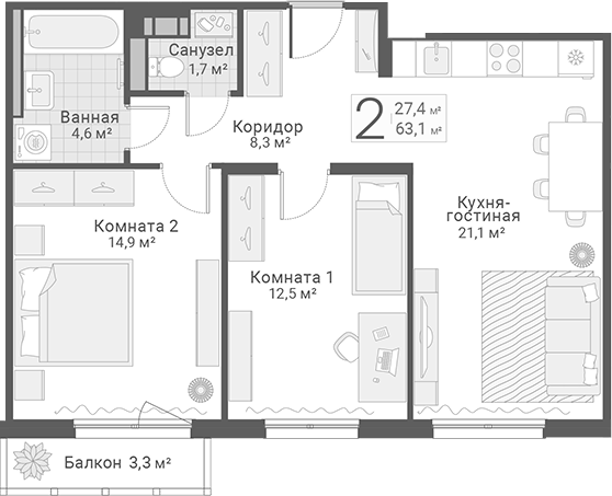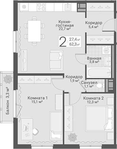 Площадь от 62.9 м2